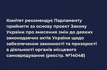 Комітет рекомендує Парламенту прийняти за основу проект Закону України про внесення змін до деяких законодавчих актів України щодо забезпечення законності та прозорості в діяльності органів місцевого самоврядування (реєстр. №14048)