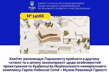 Комітет рекомендує Парламенту прийняти в другому читанні та в цілому законопроєкт з реєстр. №14166 щодо особливостей проектування та будівництва Національного меморіального комплексу Героїв Небесної Сотні – Музею Революції Гідності