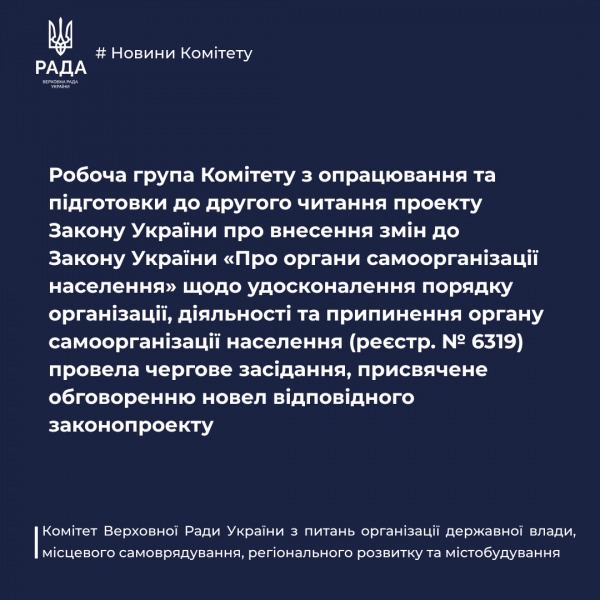 5 вересня 2025 року в режимі відеоконференції на платформі ZOOM відбулось чергове засідання Робочої групи Комітету з опрацювання та підготовки до другого читання проекту Закону України про внесення змін до Закону України «Про органи самоорганізації населення» щодо удосконалення порядку організації, діяльності та припинення органу самоорганізації населення (реєстр. № 6319).