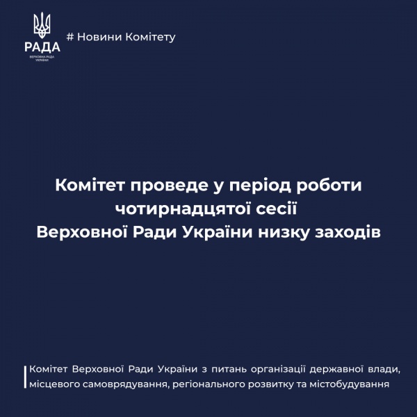 Членами Комітету затверджено Розділ VІ Плану роботи Комітету Верховної Ради України з питань організації державної влади, місцевого самоврядування, регіонального розвитку та містобудування на період чотирнадцятої сесії Верховної Ради України дев’ятого скликання щодо конференцій, семінарів, круглих столів, інших заходів, які будуть проводитися Комітетом або за його участю.