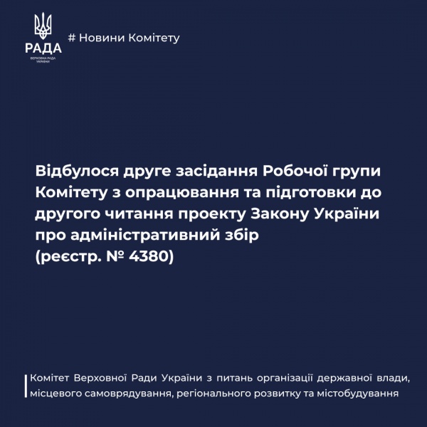 26 вересня 2025 року відбулося друге засідання Робочої групи Комітету з опрацювання та підготовки до другого читання проекту Закону України про адміністративний збір (реєстр. № 4380).