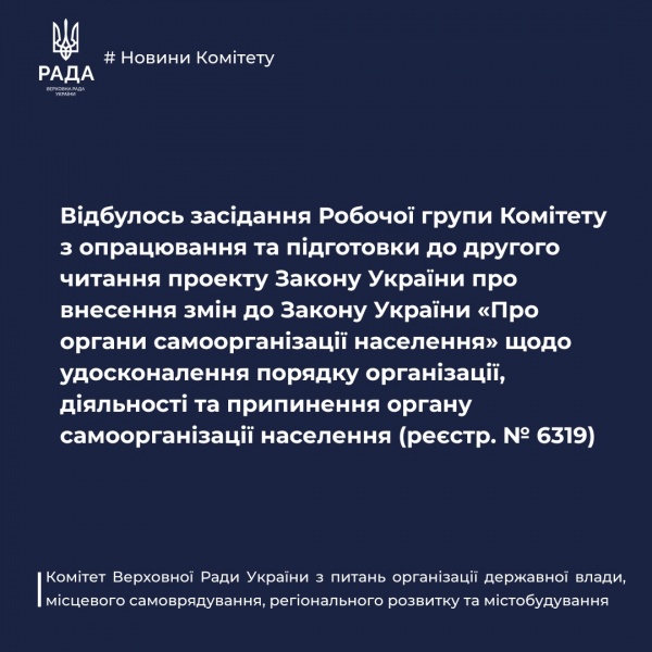 3 жовтня 2025 року Робоча група Комітету з опрацювання та підготовки до другого читання проекту Закону України про внесення змін до Закону України «Про органи самоорганізації населення» щодо удосконалення порядку організації, діяльності та припинення органу самоорганізації населення (реєстр. № 6319) провела чергове засідання.