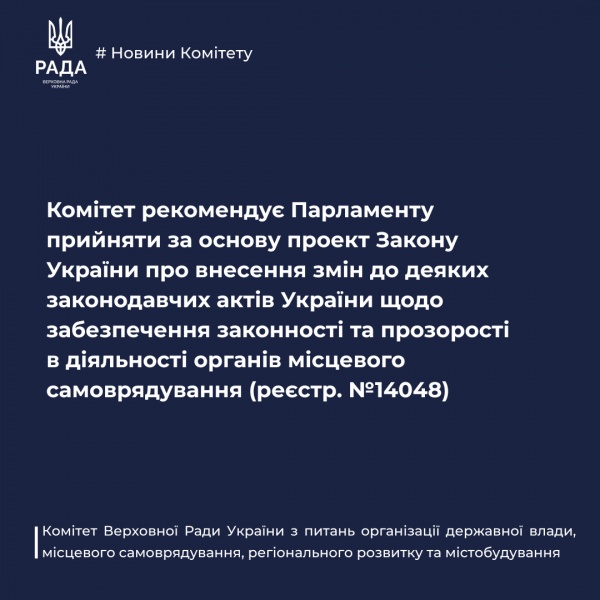 Комітет на своєму засіданні 6 жовтня 2025 року розглянув проект Закону України про внесення змін до деяких законодавчих актів України щодо забезпечення законності та прозорості в діяльності органів місцевого самоврядування (реєстр. №14048), поданий народним депутатом України В.Безгіним та іншими народними депутатами України.