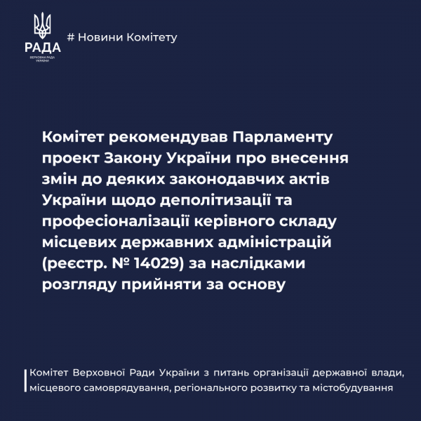 Комітет з питань організації державної влади, місцевого самоврядування, регіонального розвитку та містобудування на своєму засіданні 6 жовтня 2025 року розглянув проект Закону України про внесення змін до деяких законодавчих актів України щодо деполітизації та професіоналізації керівного складу місцевих державних адміністрацій (реєстр. № 14029), поданий народним депутатом України Р. Лозинським та іншими народними депутатами України.