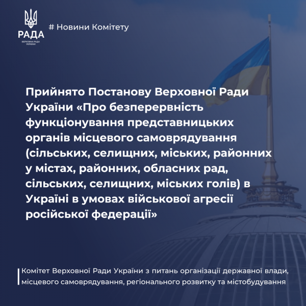 Парламент на своєму засіданні 8 жовтня 2025 року розглянув та прийняв в цілому Постанову Верховної Ради України «Про безперервність функціонування представницьких органів місцевого самоврядування (сільських, селищних, міських, районних у містах, районних, обласних рад, сільських, селищних, міських голів) в Україні в умовах військової агресії російської федерації». Відповідний проект був внесений народним депутатом України Р.Стефанчуком та іншими народними депутатами України 11 вересня 2025 року та зареєстрований за № 14031.