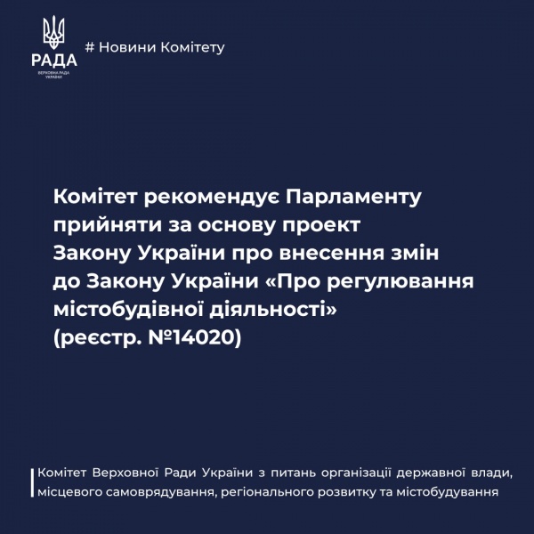 Комітет на своєму засіданні 6 жовтня 2025 року розглянув проект Закону України про внесення змін до Закону України «Про регулювання містобудівної діяльності», поданий народним депутатом України І.Калауром та іншими народними депутатами України (реєстр. № 14020), і ухвалив висновок рекомендувати Парламенту включити його до порядку денного чотирнадцятої сесії Верховної Ради України дев’ятого скликання та за наслідками розгляду в першому читанні прийняти за основу.
