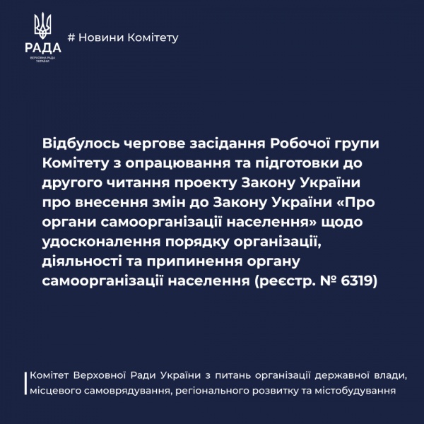 16 жовтня 2025 року в режимі відеоконференції на платформі ZOOM Робоча група Комітету з опрацювання та підготовки до другого читання проекту Закону України про внесення змін до Закону України «Про органи самоорганізації населення» щодо удосконалення порядку організації, діяльності та припинення органу самоорганізації населення (реєстр. № 6319) провела чергове засідання, під час якого обговорила положення відповідного законопроекту та внесені суб’єктами права законодавчої ініціативи поправки і пропозиції щодо переліку та порядку надання повноважень органу самоорганізації населення, фінансової і матеріальної основи його діяльності.