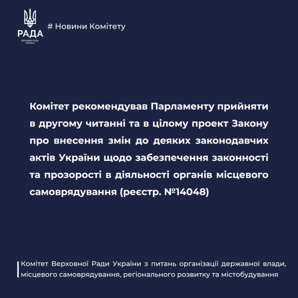 Комітет на засіданні 29 жовтня 2025 року розглянув пропозиції, що надійшли від суб’єктів права законодавчої ініціативи до законопроекту з реєстр. № 14048, та за наслідками розгляду рекомендував Верховній Раді України прийняти даний законопроект в другому читанні та в цілому.