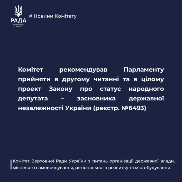 Комітет на своєму засіданні 29 жовтня 2025 року розглянув пропозиції, що надійшли від суб’єктів права законодавчої ініціативи до законопроекту з реєстр. № 6493, та за наслідками розгляду рекомендував Верховній Раді України прийняти даний законопроект в другому читанні та в цілому.