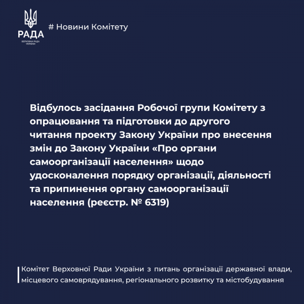 3 листопада 2025 року Робоча група Комітету з опрацювання та підготовки до другого читання проекту Закону України про внесення змін до Закону України «Про органи самоорганізації населення» щодо удосконалення порядку організації, діяльності та припинення органу самоорганізації населення (реєстр. № 6319) провела чергове засідання.