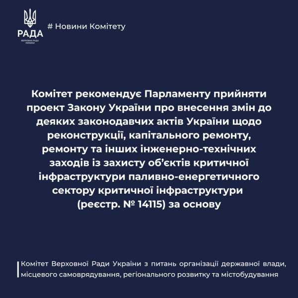 Комітет на своєму засіданні 14 листопада 2025 року розглянув проект Закону України про внесення змін до деяких законодавчих актів України щодо реконструкції, капітального ремонту, ремонту та інших інженерно-технічних заходів із захисту об’єктів критичної інфраструктури паливно-енергетичного сектору критичної інфраструктури (реєстр. № 14115) і ухвалив висновок рекомендувати Парламенту включити його до порядку денного чотирнадцятої сесії Верховної Ради України дев’ятого скликання та за наслідками розгляду в першому читанні прийняти за основу.