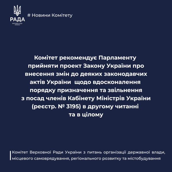 Комітет рекомендує Парламенту прийняти проект Закону України про внесення змін до деяких законодавчих актів України щодо вдосконалення порядку призначення та звільнення з посад членів Кабінету Міністрів України (реєстр. № 3195) в другому читанні та в цілому