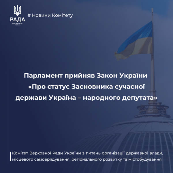 На пленарному засіданні 3 грудня 2025 року Верховною Радою України за наслідками розгляду в другому читанні 273-ма голосами народних депутатів України прийнято Закон України «Про статус Засновника сучасної держави Україна – народного депутата» (законопроект з реєстр № 6493).