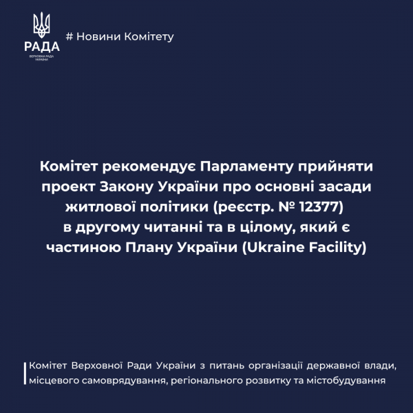 Прийняття законопроекту № 12377 є частиною Плану України (Ukraine Facility) у розділі «Людський капітал», реформа «Забезпечення доступу до житла» та важливим кроком для виконання зобов’язань України перед Європейським Союзом у контексті євроінтеграції. Строк виконання цього індикатора ‒ IV квартал 2025 року.