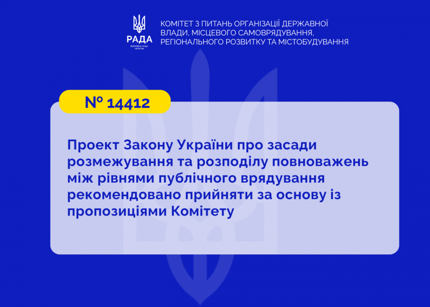 Комітет з питань організації державної влади, місцевого самоврядування, регіонального розвитку та містобудування на своєму засіданні 19 березня повторно розглянув урядовий законопроект про засади розмежування та розподілу повноважень між рівнями публічного врядування (реєстр. № 14412).