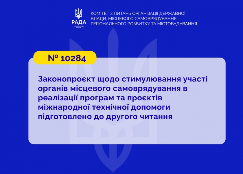 Комітет підготував до другого читання законопроєкт щодо стимулювання участі органів місцевого самоврядування в реалізації програм/проєктів міжнародної технічної допомоги та міжнародного територіального співробітництва (реєстр. № 10284).