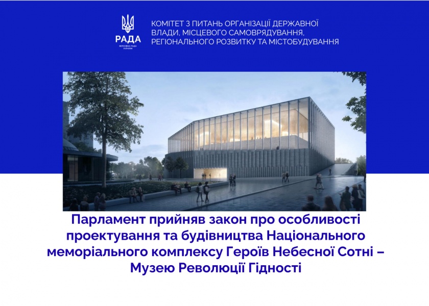 Верховна Рада на своєму засіданні 29 квітня прийняла закон про особливості проєктування та будівництва Національного меморіального комплексу Героїв Небесної Сотні – Музею Революції Гідності (реєстр. № 14166).