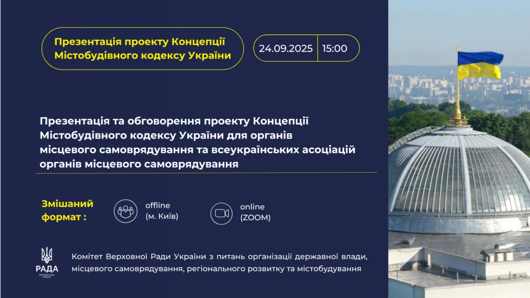 24 вересня 2025 року о 15:00 відбудеться презентація та обговорення проекту Концепції Містобудівного кодексу України для органів місцевого самоврядування та всеукраїнських асоціацій органів місцевого самоврядування.
