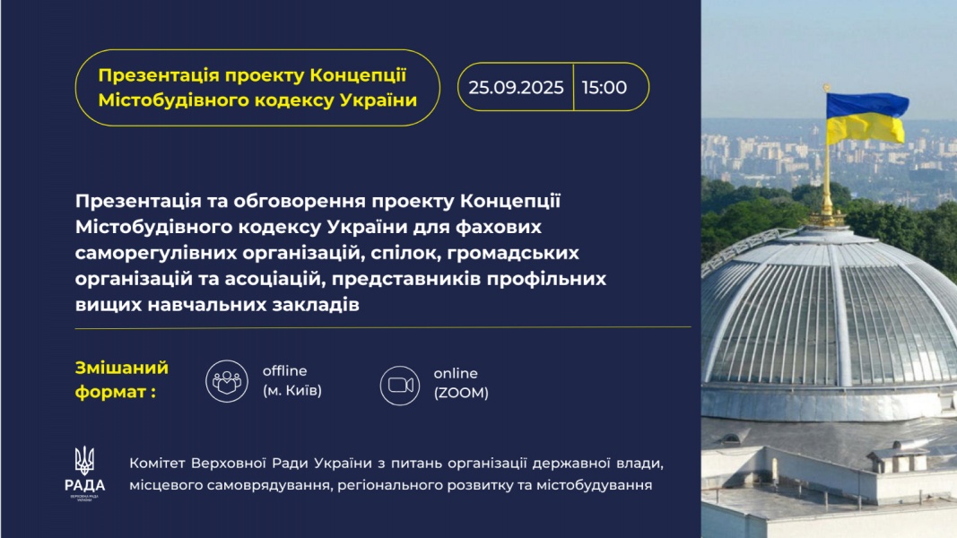 25 вересня 2025 року о 15:00 відбудеться презентація та обговорення проекту Концепції Містобудівного кодексу України для фахових саморегулівних організацій, спілок, громадських організацій та асоціацій, представників профільних вищих навчальних закладів.