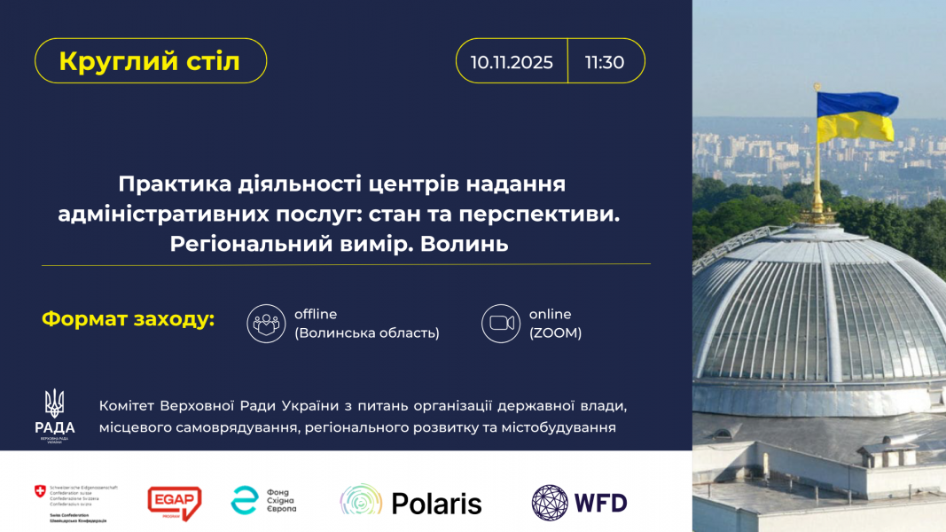 Комітет відповідно до Плану своєї роботи на період чотирнадцятої сесії Верховної Ради України IХ скликання проведе круглий стіл: «Практика діяльності центрів надання адміністративних послуг: стан та перспективи. Регіональний вимір. Волинь».