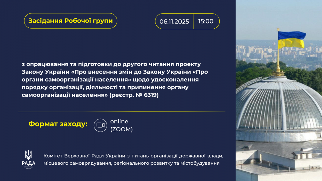 6 листопада 2025 року о 15:00 відбудеться фінальне засідання Робочої групи Комітету Верховної Ради України з питань організації державної влади, місцевого самоврядування, регіонального розвитку та містобудування з опрацювання та підготовки до другого читання проекту Закону України «Про внесення змін до Закону України «Про органи самоорганізації населення» щодо удосконалення порядку організації, діяльності та припинення органу самоорганізації населення» (реєстр. № 6319).