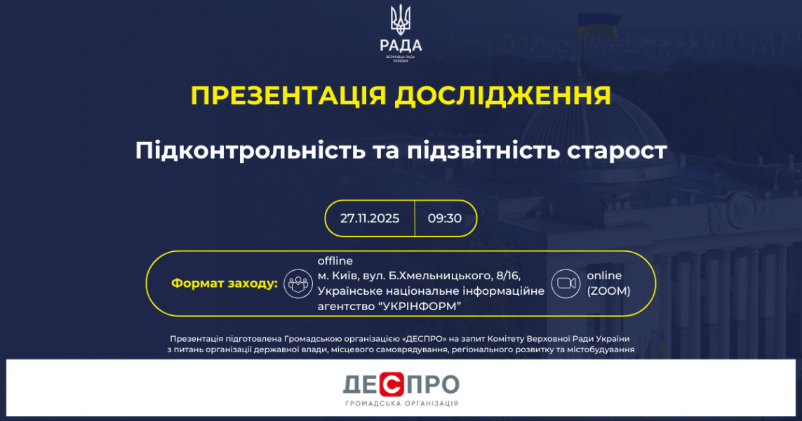 27 листопада 2025 року о 9:30 відбудеться презентація дослідження «Підконтрольність та підзвітність старост», підготовленого Громадською організацією «ДЕСПРО» на запит Комітету Верховної Ради України з питань організації державної влади, місцевого самоврядування, регіонального розвитку та містобудування.