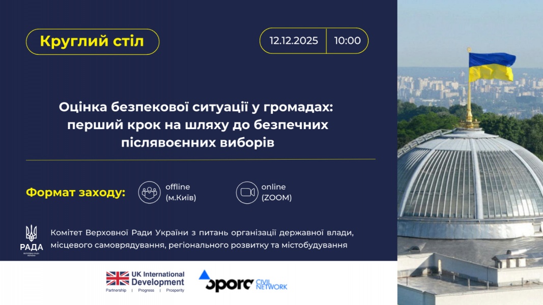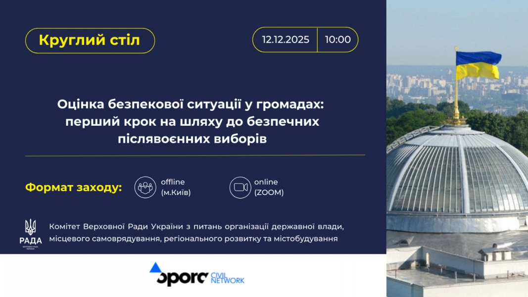 Комітет з питань організації державної влади, місцевого самоврядування, регіонального розвитку та містобудування відповідно до Плану своєї роботи на період чотирнадцятої сесії Верховної Ради України IХ скликання спільно з Всеукраїнською громадською організацією «Громадянська мережа «ОПОРА» проведе круглий стіл на тему: «Оцінка безпекової ситуації у громадах: перший крок на шляху до безпечних післявоєнних виборів».