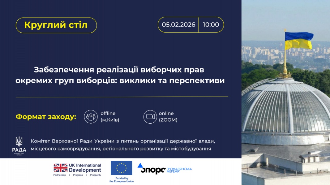 Комітет з питань організації державної влади, місцевого самоврядування, регіонального розвитку та містобудування спільно з Всеукраїнською громадською організацією «Громадянська мережа «ОПОРА» проведе круглий стіл на тему: «Забезпечення реалізації виборчих прав окремих груп виборців: виклики та перспективи».