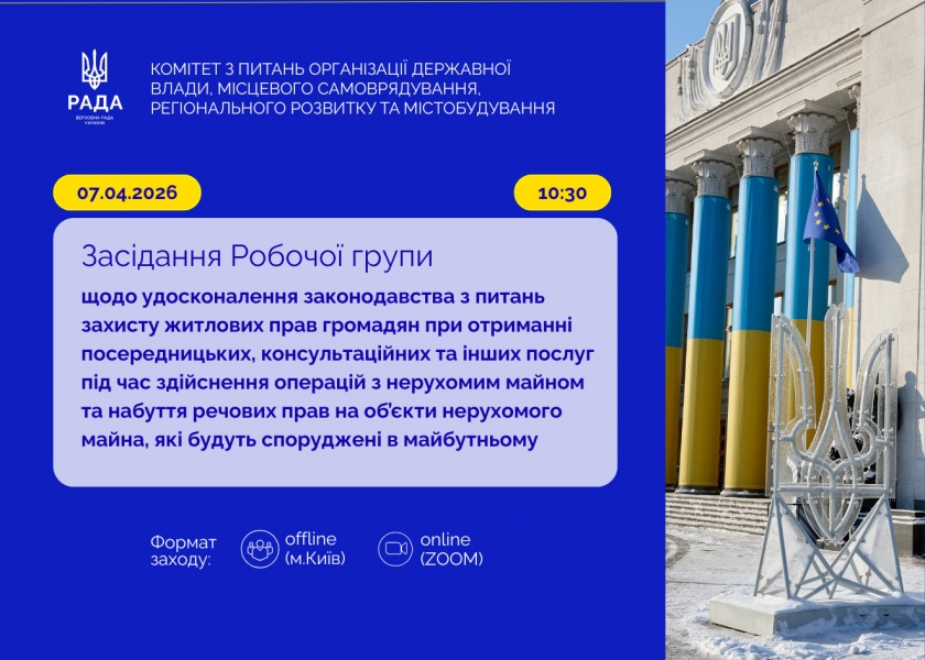 7 квітня 2026 року о 10:30 в режимі відеоконференції на платформі ZOOM відбудеться засідання Робочої групи Комітету щодо удосконалення законодавства з питань захисту житлових прав громадян при отриманні посередницьких, консультаційних та інших послуг під час здійснення операцій з нерухомим майном та набуття речових прав на об’єкти нерухомого майна, які будуть споруджені в майбутньому.